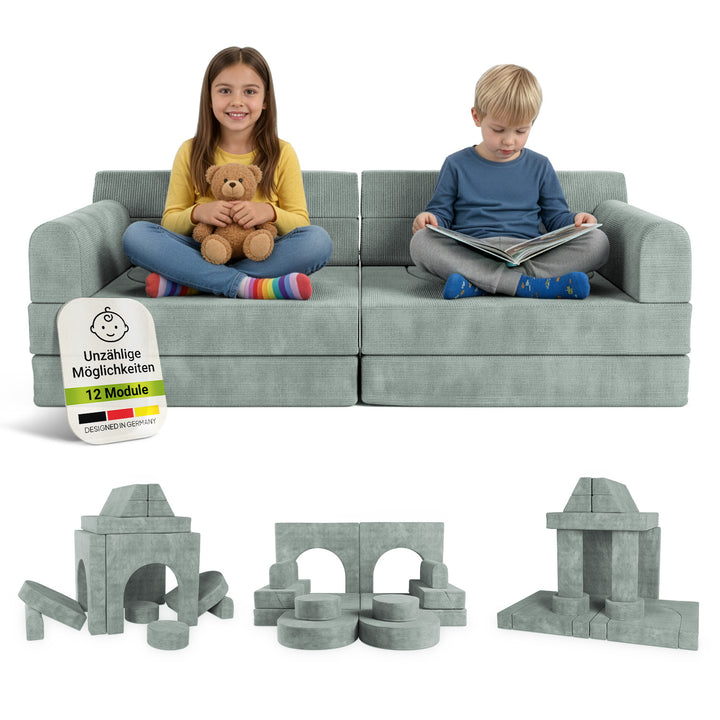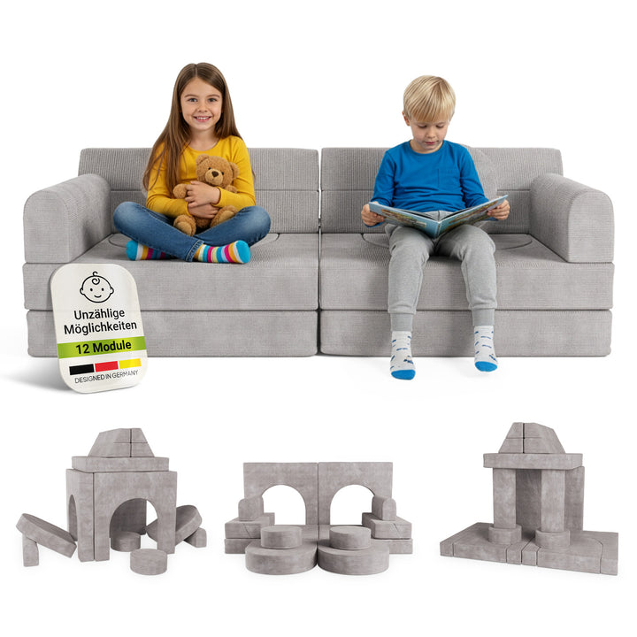 12 Elemente wie Sitz- und Formkissen eröffnen immer neue Varianten – so bleibt die Spielcouch über Jahre spannend und wächst mit den Bedürfnissen der Kinder mit.