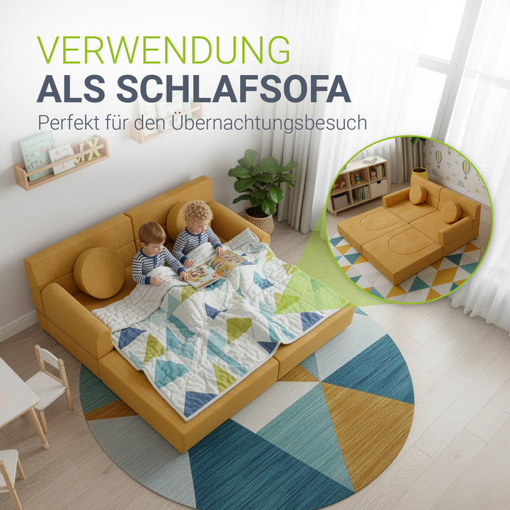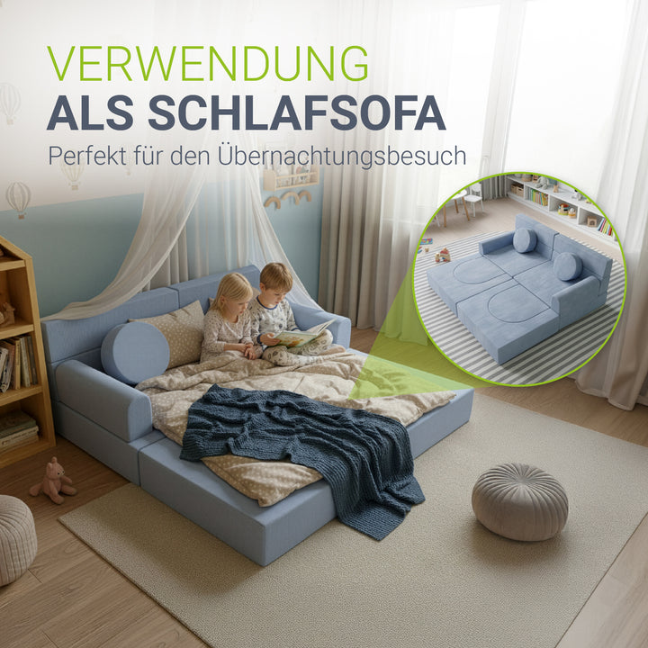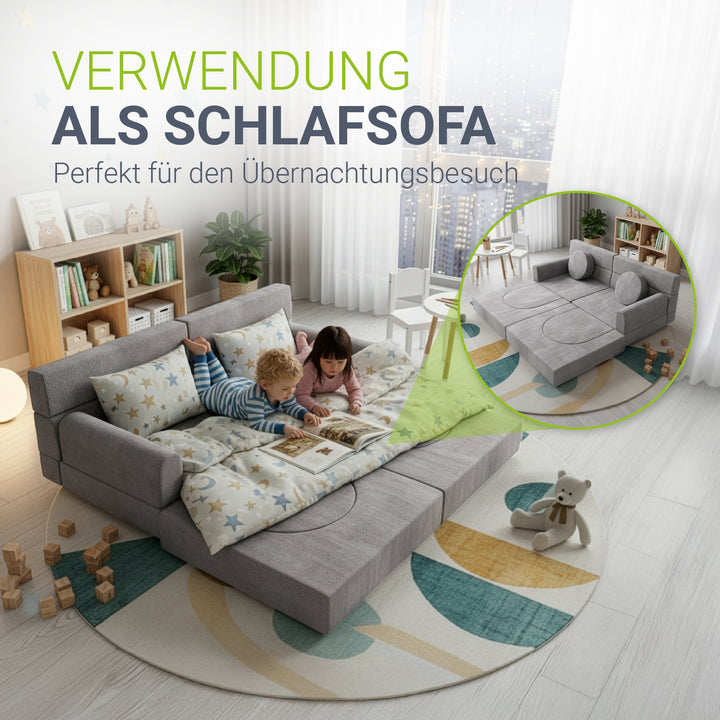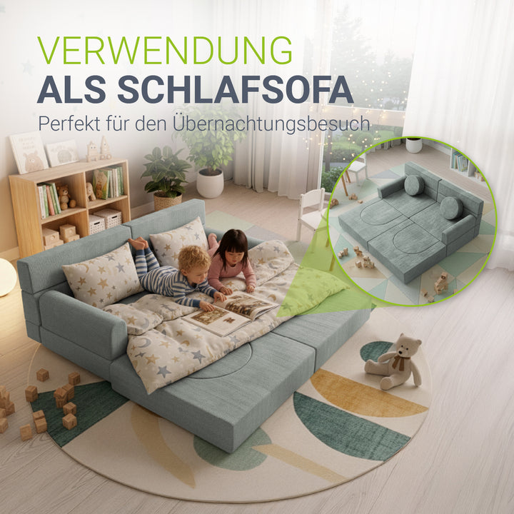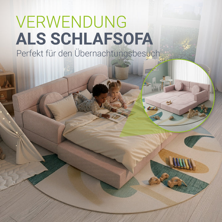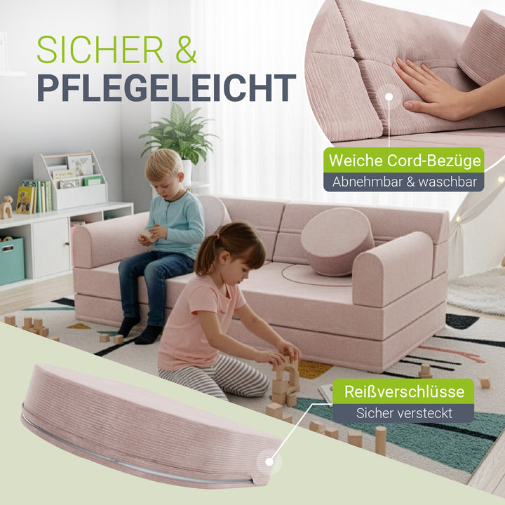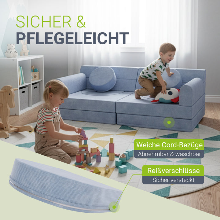 Weiche Polster und abgerundete Kanten schützen beim Spielen und machen die Couch zu einem sicheren Ort, an dem Eltern ihre Kinder beruhigt spielen lassen können.
