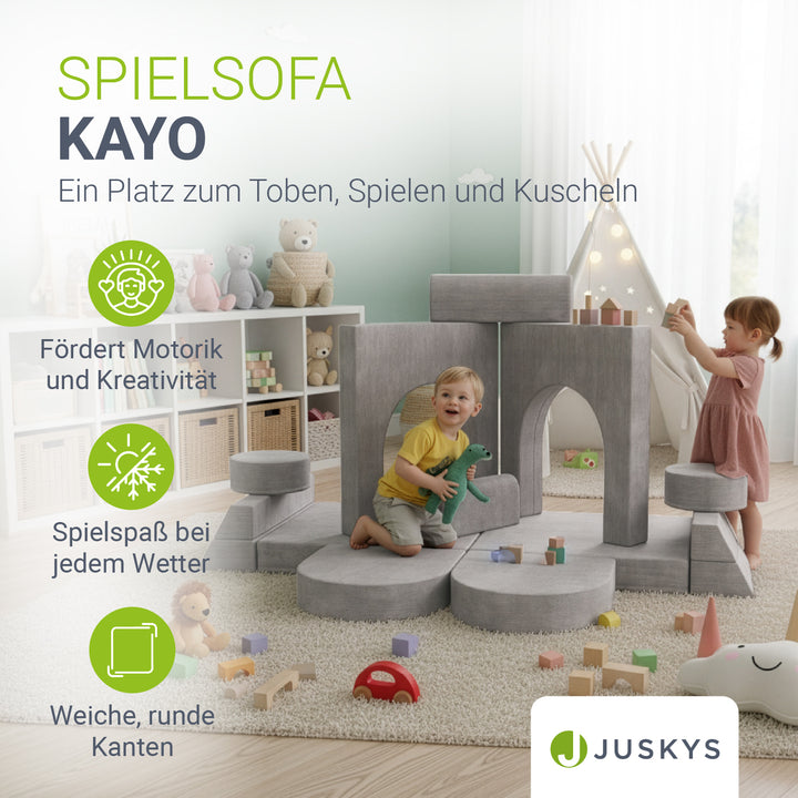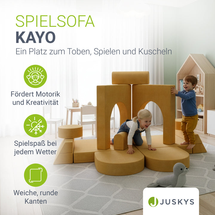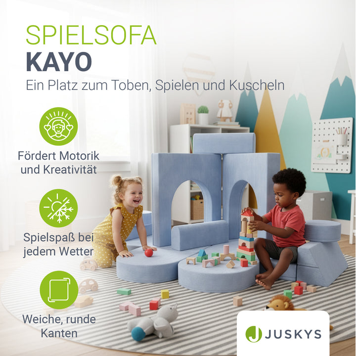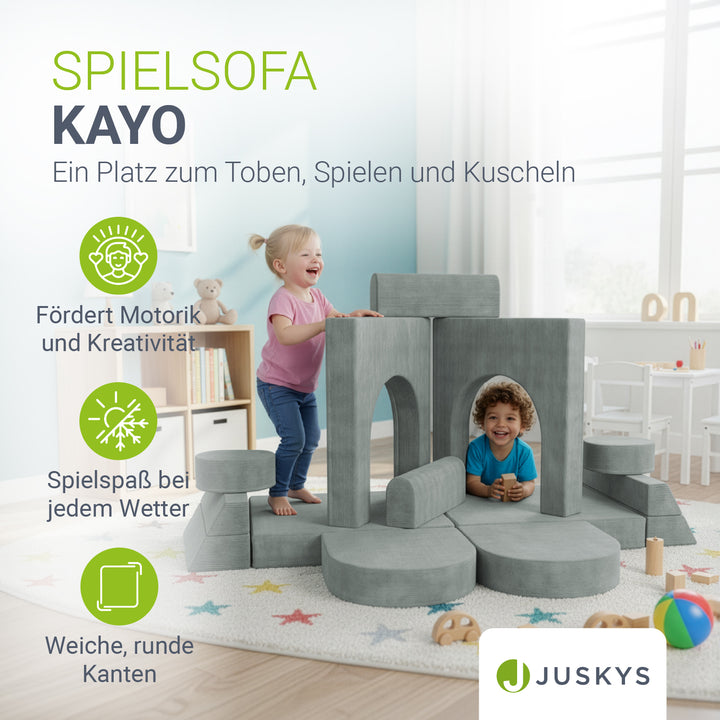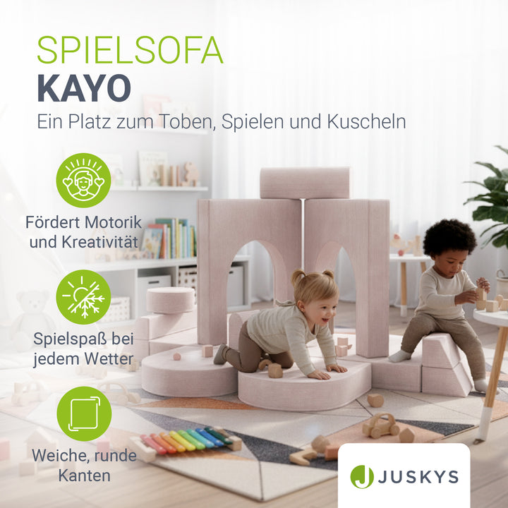 Ein Platz zum Toben, Spielen und Kuscheln – geschaffen für kleine Entdecker. Die modularen Elemente des Kinder Spielsofas Kayo lassen sich nach Belieben umbauen: Heute eine Burg, morgen eine gemütliche Schlafcouch oder ein spannendes Krabbelparadies. So entstehen immer neue Welten, die Kreativität und Fantasie deiner Kinder anregen. Ob Toben, Kuscheln, Bauen oder gemeinsames Vorlesen – die weiche Polsterung sorgt für Komfort, während der kindgerechte Aufbau Sicherheit bietet. Dank des leichten Gewichts können Kinder ihre Spielcouch selbst verschieben. Abnehmbare, pflegeleichte Cord-Bezüge machen das Kindersofa zudem alltagstauglich und langlebig.