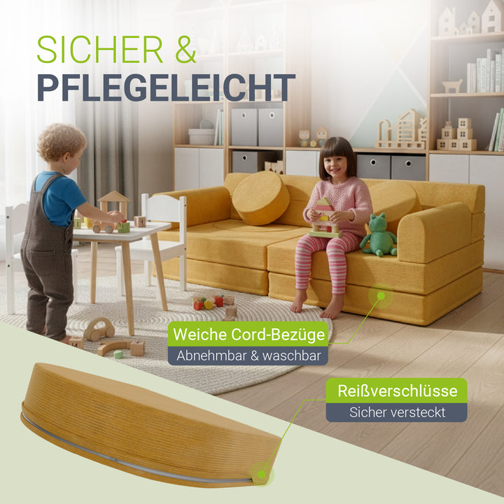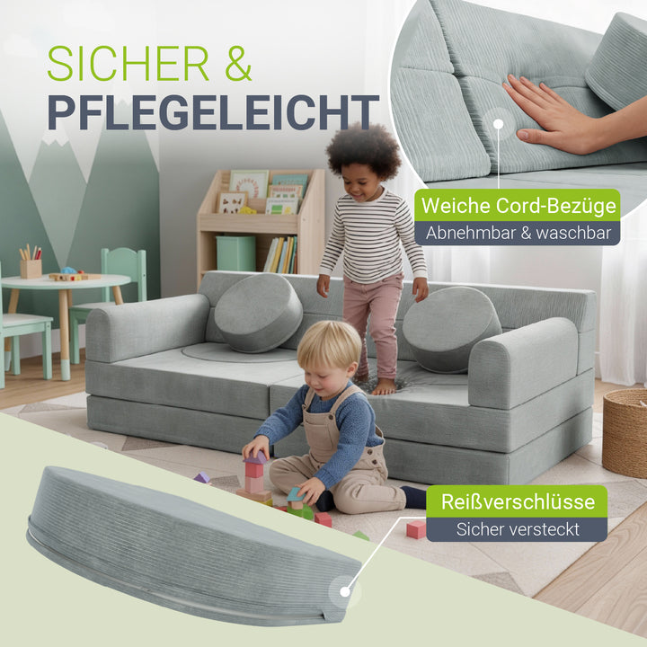 Die abnehmbaren Cord-Bezüge sind waschbar und langlebig – perfekt für Eltern, die Wert auf einfache Reinigung und Alltagstauglichkeit legen.